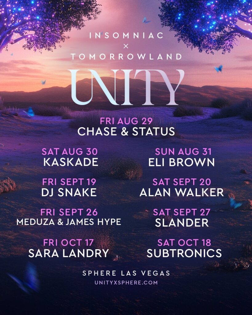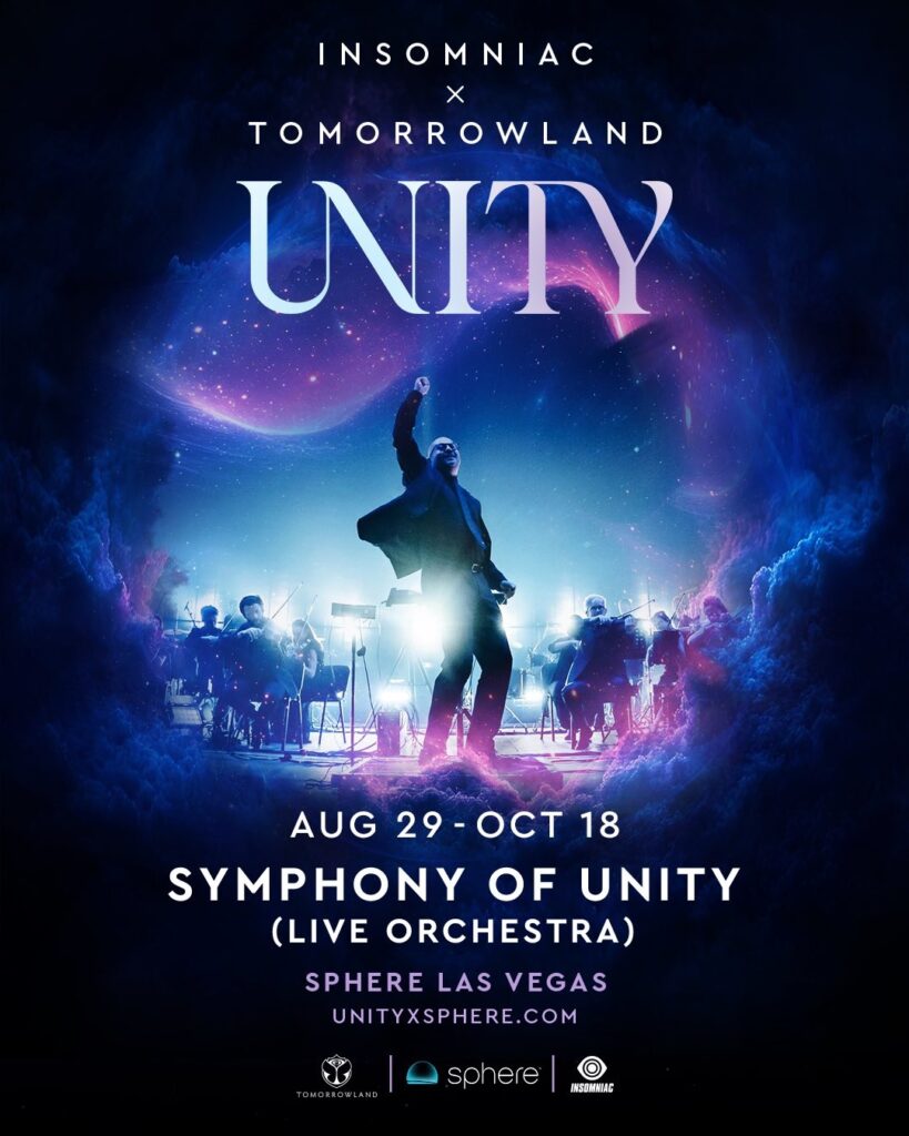 UNITY, la fusión entre los universos de Tomorrowland e Insomniac, aterriza en el Sphere Las Vegas con una propuesta totalmente inmersiva: escenarios audiovisuales 360°, orquesta en vivo, narrativas icónicas de sus festivales (Planaxis, Adscendo, Orbyz, Beyond Wonderland, Nocturnal, EDC…) y un cierre de lujo cada noche con DJs de renombre global.